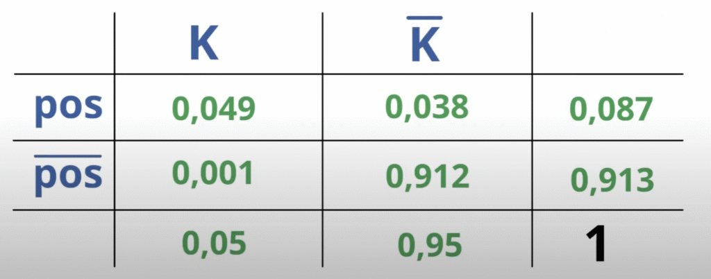 Wir haben für das Ergebnis zuvor 0.049 und 0.038 addiert. Das waren ja nichts anderes als die beiden Schnittmengen von K und pos sowie \(K^c\) und pos. Somit verwendet ihr bei der 4 Felder Tafel, wenn ihr eine Randwahrscheinlichkeit berechnet, automatisch den Satz der totalen Wahrscheinlichkeit, ohne dass es einem wirklich auffällt.