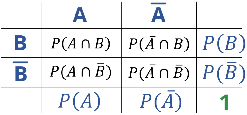 In den Feldern am Rand unserer Tafel stehen die Wahrscheinlichkeiten der jeweiligen Ereignisse. P(A) ist die Wahrscheinlichkeit des Ereignisses A und \(P(\overline{A})\) bzw. \(P(A^c)\) die Gegenwahrscheinlichkeit. Für B ist es natürlich dasselbe. Wir erhalten diese Randwahrscheinlichkeiten jeweils mit dem Satz der vollständigen Wahrscheinlichkeit (dazu gleich noch mehr).
