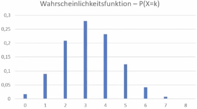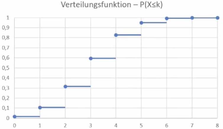 Mit der Wahrscheinlichkeitsfunktion bestimmen wir die Wahrscheinlichkeit von \(P(X=k)\) und mit der Verteilungsfunktion \(P(X\leq k)\). Wenn ihr mehr zu diesem Thema wissen wollt, schaut euch bitte das Video zu diskreten Zufallsvariablen an.