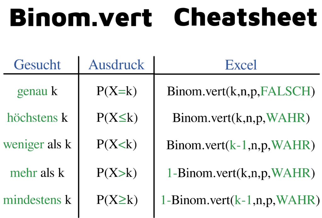 In Excel können wir die Funktion Binom.vert fürs Berechnen von Wahrscheinlichkeiten verwenden. Man muss die Werte für k, n und p angeben und am Ende noch kumuliert WAHR oder FALSCH. Wenn wir FALSCH angeben, handelt es sich um die Wahrscheinlichkeitsfunktion, wenn wir WAHR angeben um die Verteilungsfunktion.