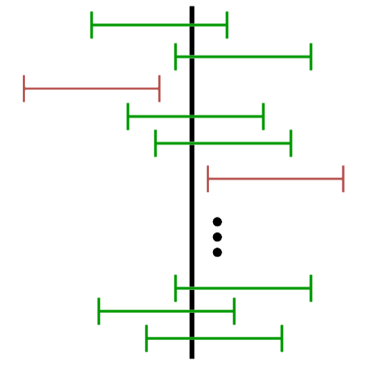 Das Ganze machen wir 100 Mal und bei 5 von diesen 100 Konfidenzintervallen würde der wahre Wert nun außerhalb des Intervalls liegen. Das entspricht dann einer 95-prozentigen Sicherheit.