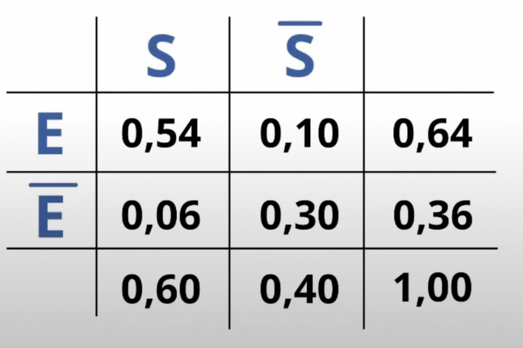 $$P(E | S) = \frac{P(E \cap S)}{P(S)} = \frac{0.54}{0.6} = 0.9 ≠ P(E)$$